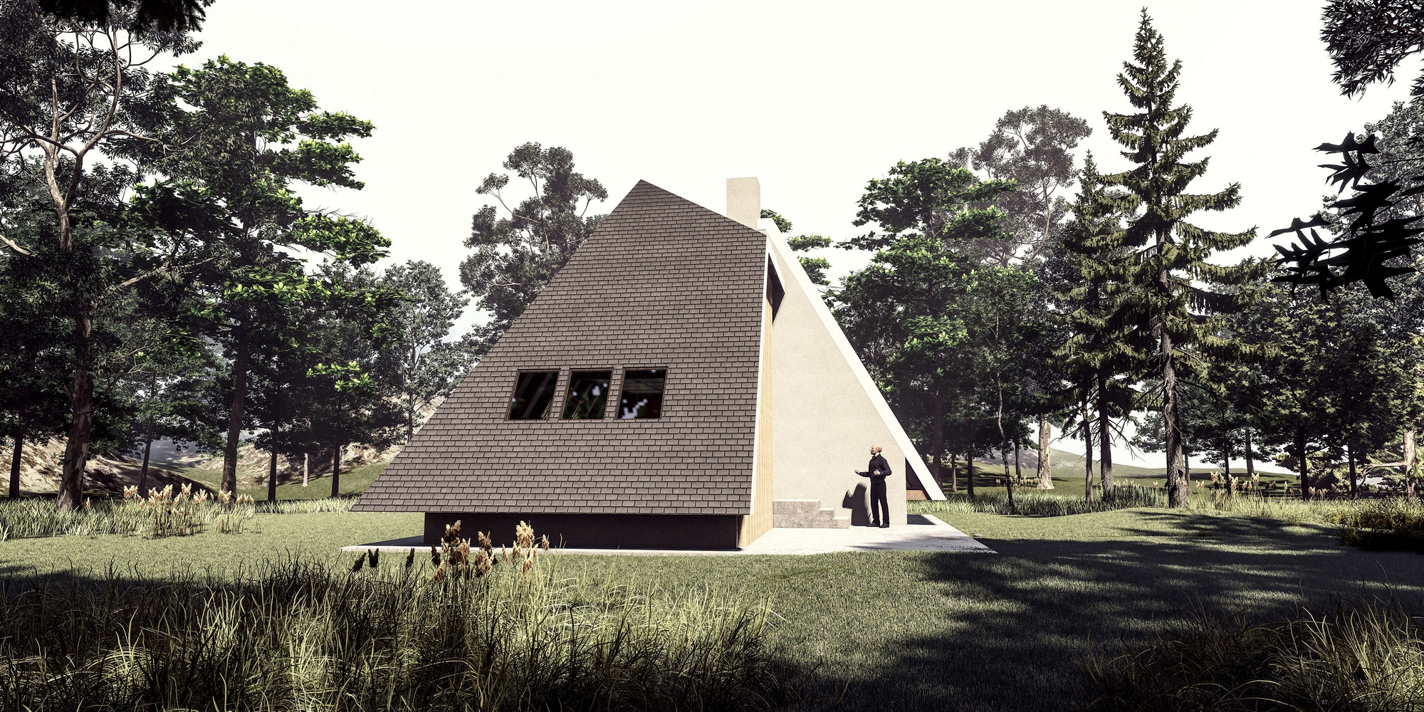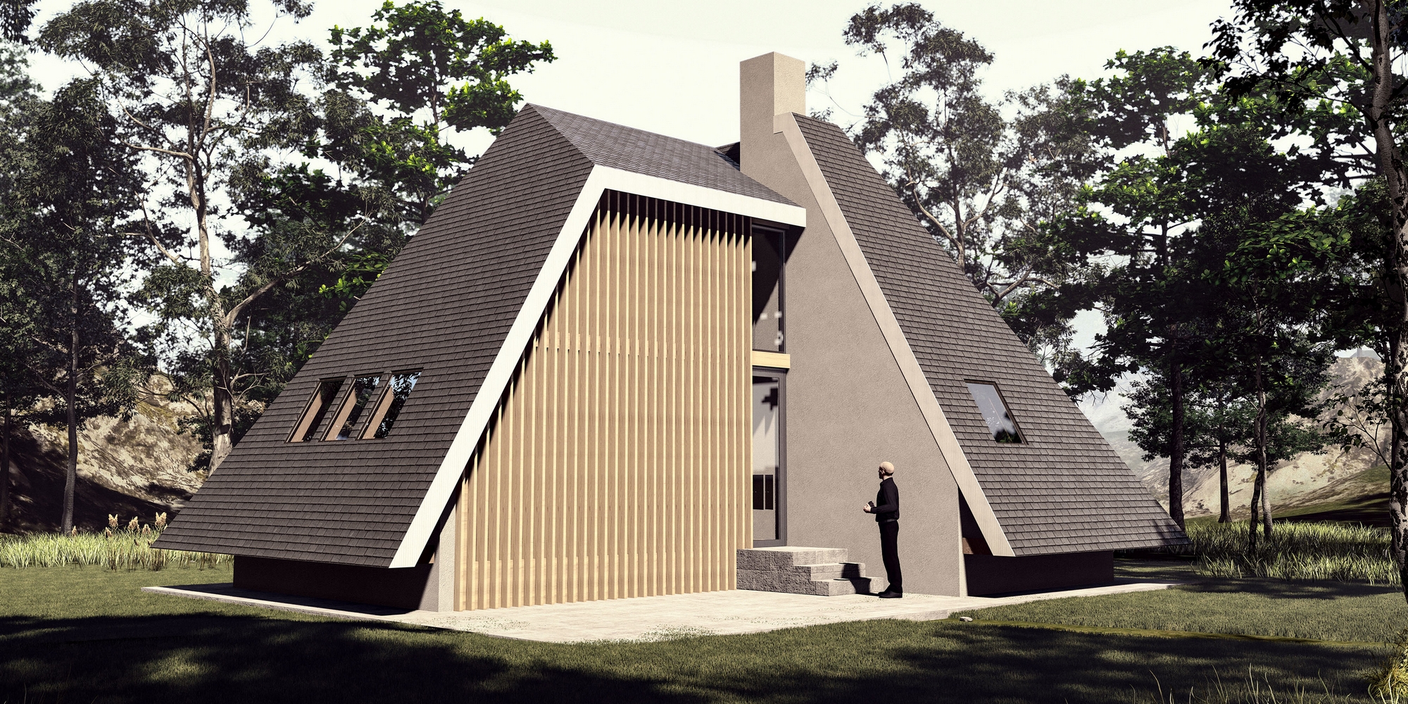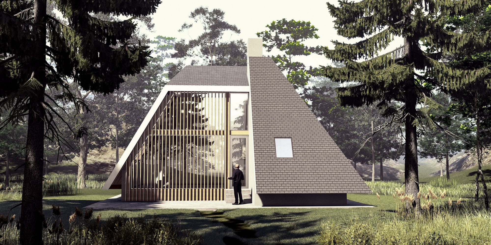 Planinska kuća je projektovana za odmor u brdsko-planinskom predelu, namenjena kako za povremeni, tako i za stalni boravak. Svojim oblikom i materijalizacijom, kuća se skladno uklapa u okolni pejzaž, pružajući savremeno arhitektonsko rešenje prilagođeno prirodnom okruženju planine. Objekat je osmišljen u formi dva asimetrična volumena koja se međusobno preklapaju, stvarajući dinamičnu kompoziciju prostora. Ovakva forma kuće, sa naglašenim A-krovom, omogućava optimalno korišćenje unutrašnjeg prostora, dok istovremeno pruža zaštitu od spoljašnjih vremenskih uslova. Krovna konstrukcija, izrađena od drvenih greda, obložena je tamnim crepovima, čime se postigla vizuelna povezanost sa prirodnim elementima okruženja. Unutrašnji prostori organizovani su sa posebnim akcentom na funkcionalnost i udobnost, sa jasno definisanom dnevnom i noćnom zonom. Prostrani dnevni boravak, otvorenog plana, pruža direktnu vizuelnu komunikaciju sa spoljašnjim okruženjem zahvaljujući velikim prozorskim površinama koje propuštaju obilje prirodne svetlosti. Kamin, centralno postavljen unutar prostora, stvara prijatan i topao ambijent tokom hladnih zimskih meseci. Noćna zona obuhvata udobne spavaće sobe, smeštene tako da obezbeđuju maksimalnu privatnost i mir korisnicima, dok su pomoćne prostorije diskretno integrisane u strukturu kuće. Pri projektovanju su korišćeni ekološki prihvatljivi materijali, sa posebnim akcentom na termoizolaciju i energetsku efikasnost objekta. Eksterijer kuće ističe se minimalističkom estetikom, sa fasadom obloženom vertikalnim drvenim lamelama, koje unose prirodnu toplinu i teksturu u savremeni dizajn objekta. Ovaj arhitektonski izraz postignut je pažljivim izborom materijala i proporcija, kako bi se stvorio sklad između modernog dizajna i tradicionalnih elemenata, karakterističnih za planinske predele.