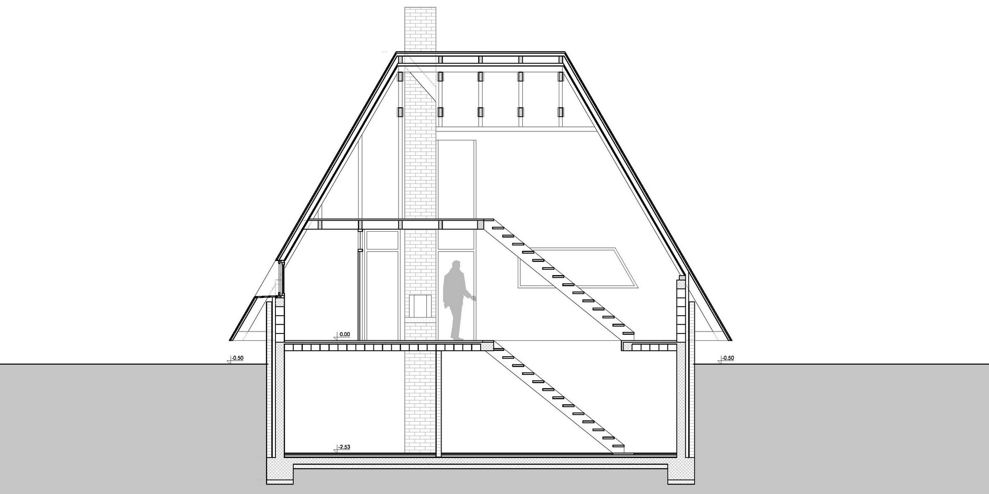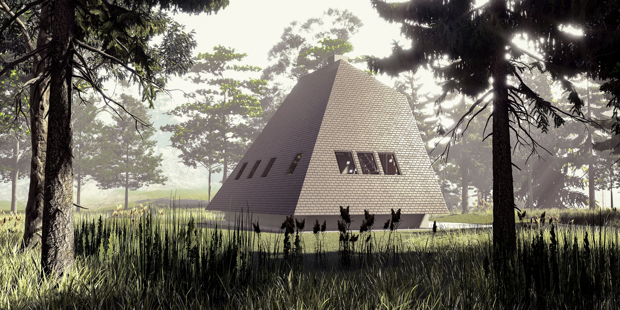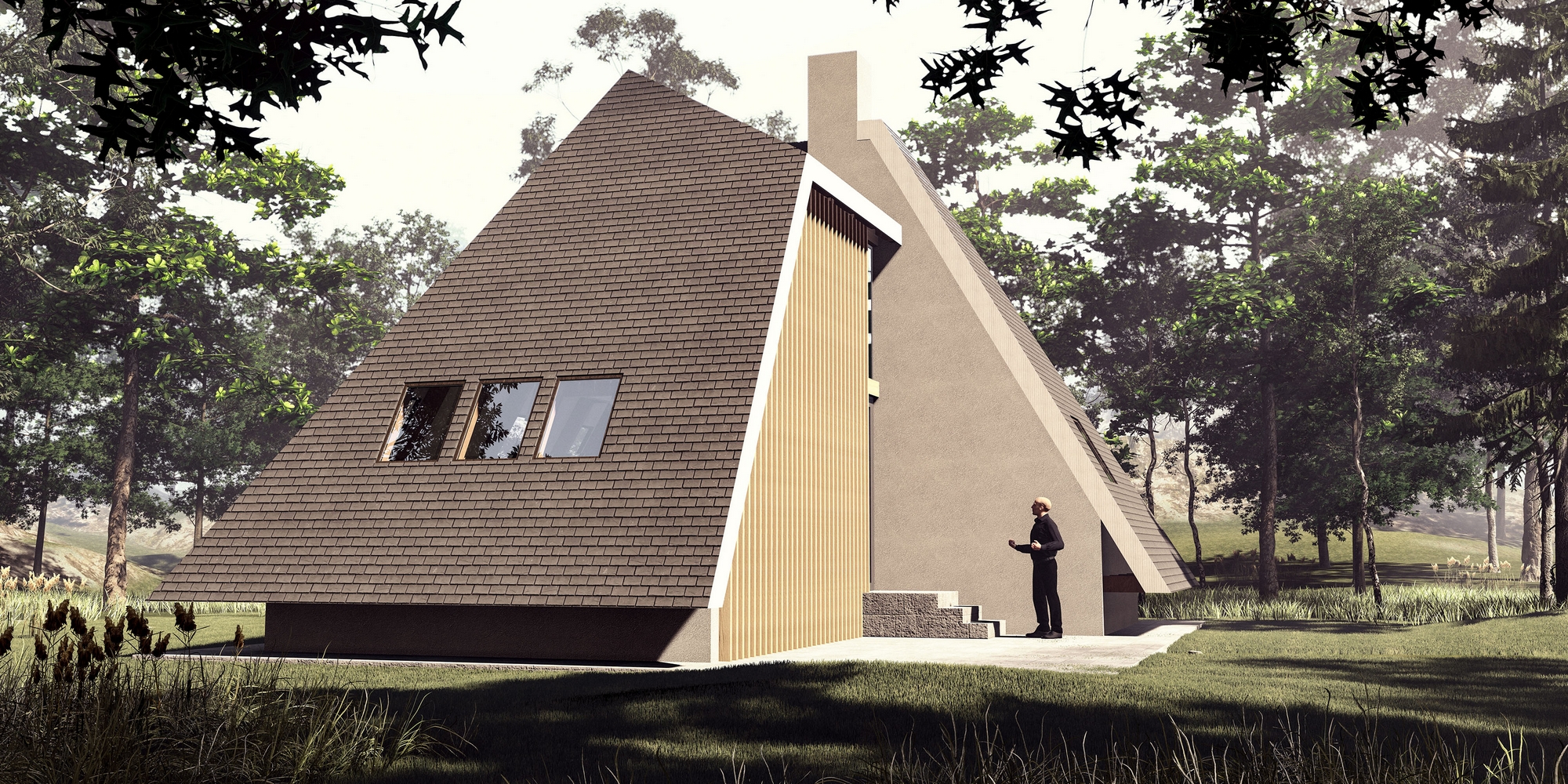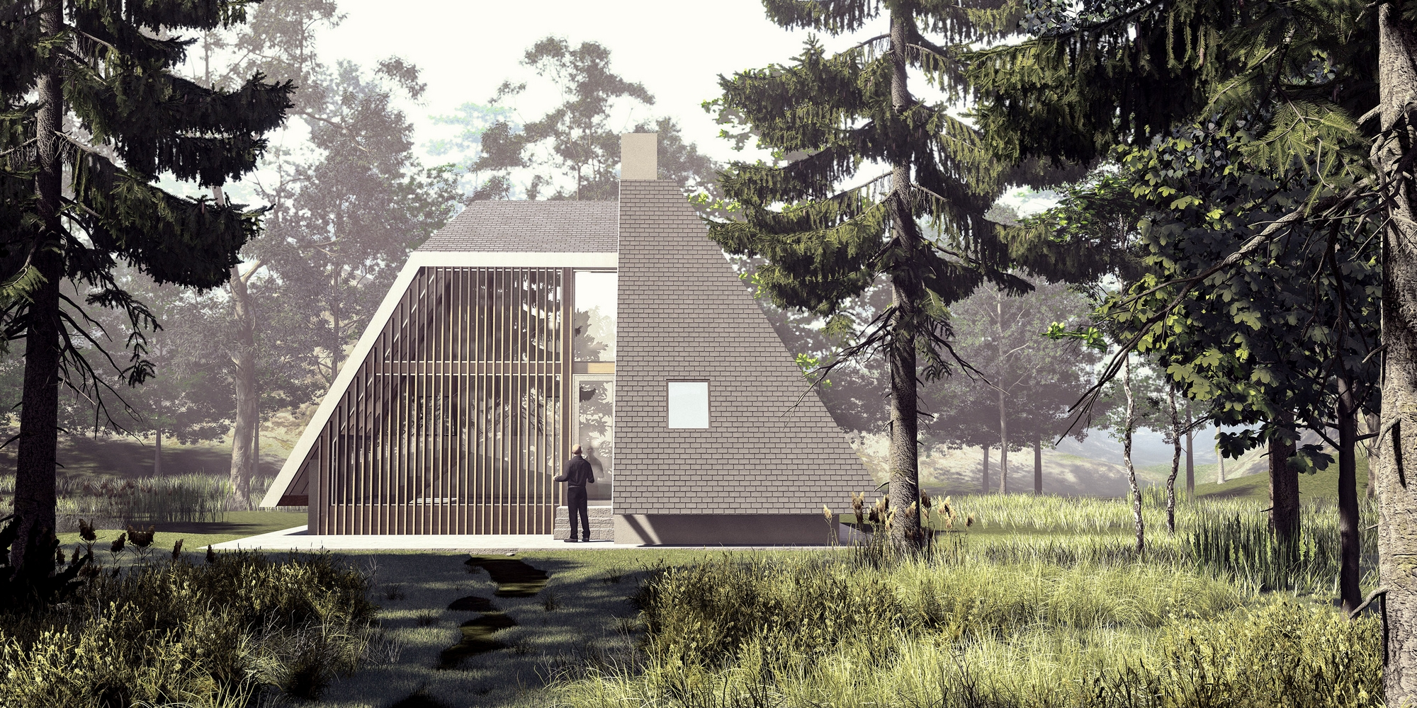 Planinska kuća je projektovana za odmor u brdsko-planinskom predelu, namenjena kako za povremeni, tako i za stalni boravak. Svojim oblikom i materijalizacijom, kuća se skladno uklapa u okolni pejzaž, pružajući savremeno arhitektonsko rešenje prilagođeno prirodnom okruženju planine. Objekat je osmišljen u formi dva asimetrična volumena koja se međusobno preklapaju, stvarajući dinamičnu kompoziciju prostora. Ovakva forma kuće, sa naglašenim A-krovom, omogućava optimalno korišćenje unutrašnjeg prostora, dok istovremeno pruža zaštitu od spoljašnjih vremenskih uslova. Krovna konstrukcija, izrađena od drvenih greda, obložena je tamnim crepovima, čime se postigla vizuelna povezanost sa prirodnim elementima okruženja. Unutrašnji prostori organizovani su sa posebnim akcentom na funkcionalnost i udobnost, sa jasno definisanom dnevnom i noćnom zonom. Prostrani dnevni boravak, otvorenog plana, pruža direktnu vizuelnu komunikaciju sa spoljašnjim okruženjem zahvaljujući velikim prozorskim površinama koje propuštaju obilje prirodne svetlosti. Kamin, centralno postavljen unutar prostora, stvara prijatan i topao ambijent tokom hladnih zimskih meseci. Noćna zona obuhvata udobne spavaće sobe, smeštene tako da obezbeđuju maksimalnu privatnost i mir korisnicima, dok su pomoćne prostorije diskretno integrisane u strukturu kuće. Pri projektovanju su korišćeni ekološki prihvatljivi materijali, sa posebnim akcentom na termoizolaciju i energetsku efikasnost objekta. Eksterijer kuće ističe se minimalističkom estetikom, sa fasadom obloženom vertikalnim drvenim lamelama, koje unose prirodnu toplinu i teksturu u savremeni dizajn objekta. Ovaj arhitektonski izraz postignut je pažljivim izborom materijala i proporcija, kako bi se stvorio sklad između modernog dizajna i tradicionalnih elemenata, karakterističnih za planinske predele.